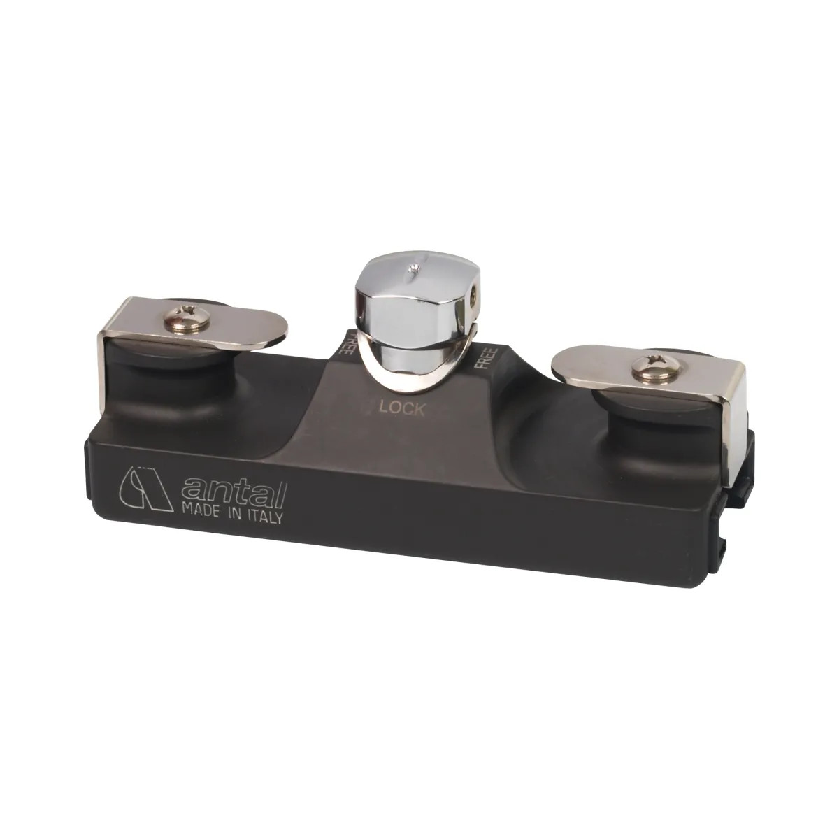 Hard black anodized aluminium car with low friction Nylon sliding inserts. AISI 316 S.Steel pin with a lock-up position. Becket for remote control line.